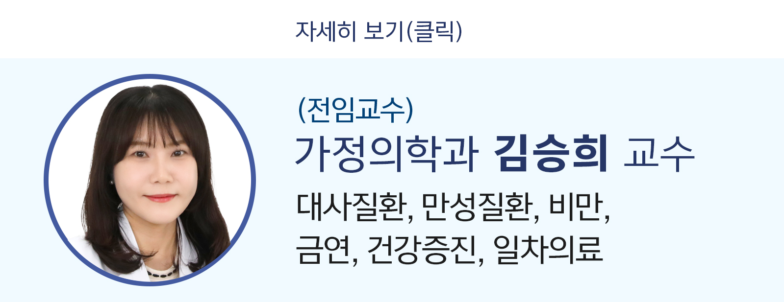 가정의학과 김승희 교수는 대사질환, 만성질환 관리, 비만, 금연 치료, 건강증진 등 일차의료 분야를 전문으로 합니다.