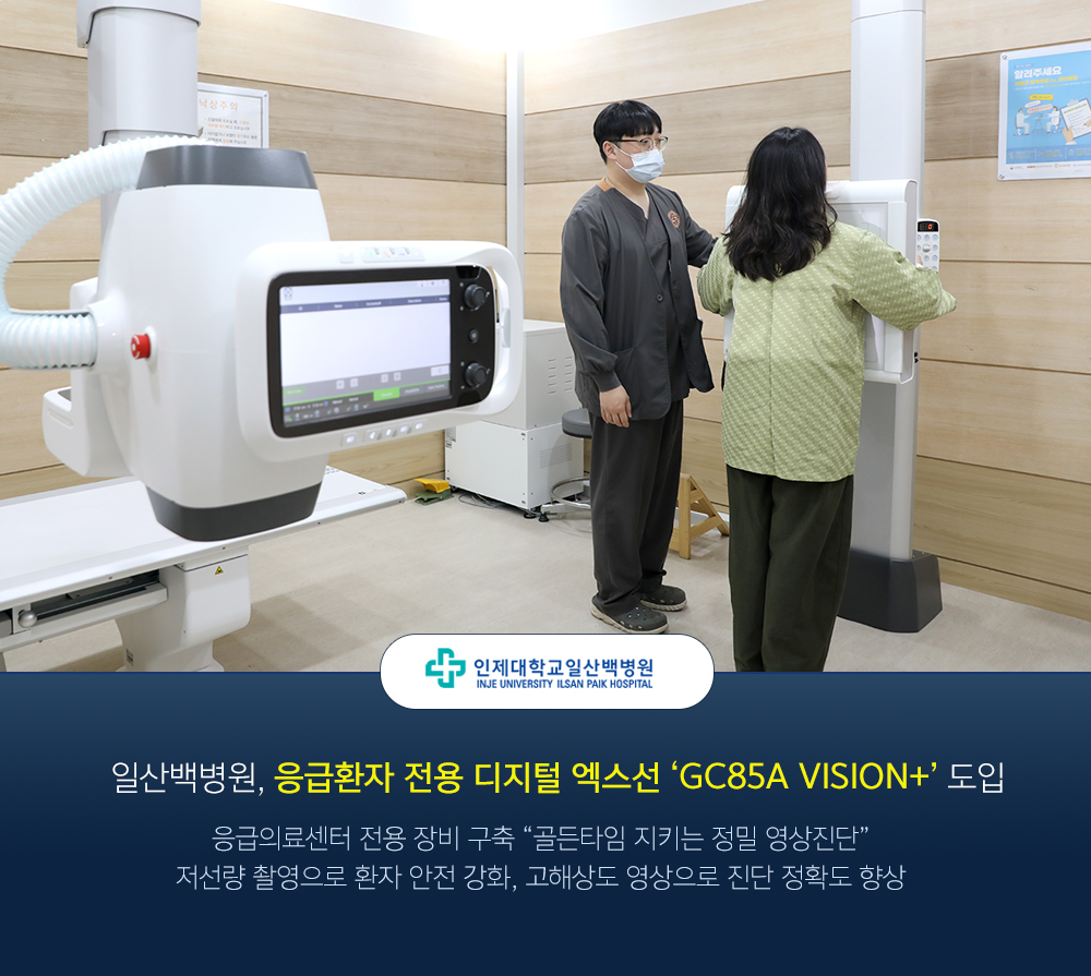 인제대학교 일산백병원(원장 최원주)이 응급환자 진료의 신속성과 정확도를 높이기 위해 최근 응급의료센터 내에 응급환자 전용 디지털 엑스선 촬영장비 ‘GC85A Vision+’를 도입하고, 본격적인 운영에 들어갔다.